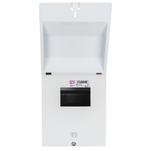 The FuseBox F1004E is a 4-module metal enclosure with an earth and neutral terminal bar. The consumer unit has a steel construction with a smooth white epoxy powder finish. The enclosure is padlockable (padlock not included) and includes conduit knockouts at the top and bottom.