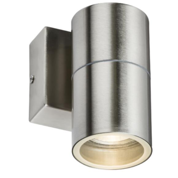 Knightsbridge Wall Light. This fixed single light has a stylish, compact design and will brighten up any exterior space. Constructed of stainless steel it holds a GU10 lamp that is available to puchase separately.