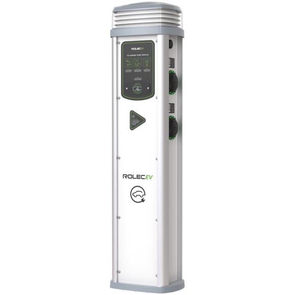 Rolec's Quantum EV range. This pedestal is a sophisticated and resilient EV charging point, providing a combination of durability and impeccable design for all locations. This future-proof OCPP compliant pedestal can offer a simple plug & charge or pay-to-charge solution via the EV drivers smartphone and/or RFID card/fob through any chosen OCPP back-office management system.
